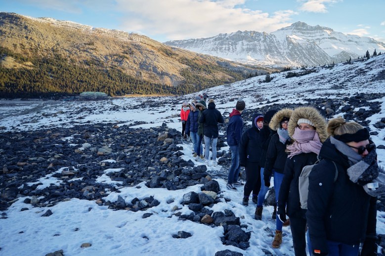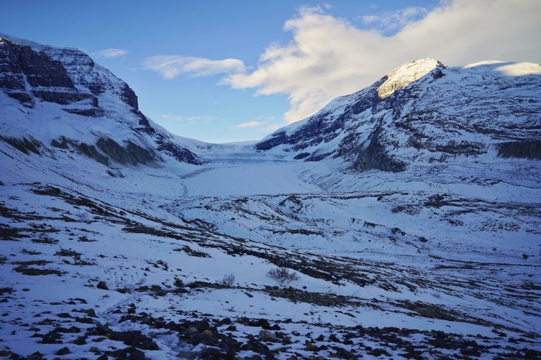 Früh ging es zum Columbia Icefield, einem Gletscher entlang der Strecke. Dort war es extrem kalt und windig.