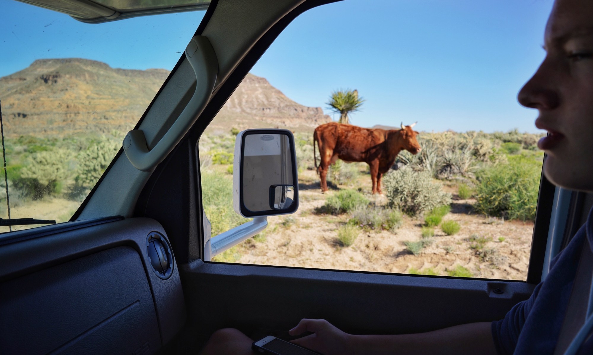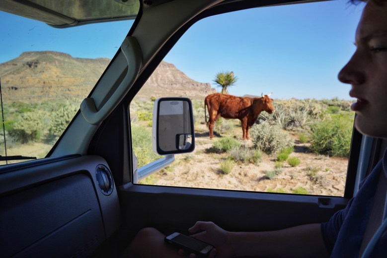 Gestern sind wir vom Zion Nationalpark, vorbei an Las Vegas bis in die Mojave Wüste gefahren. 80km ging es mitten in die „unberührte“ Natur. Am Anfang noch auf einer befestigten Straße, am Ende nur noch auf einer „heavy dirt road“, links und rechts Rinderherden…