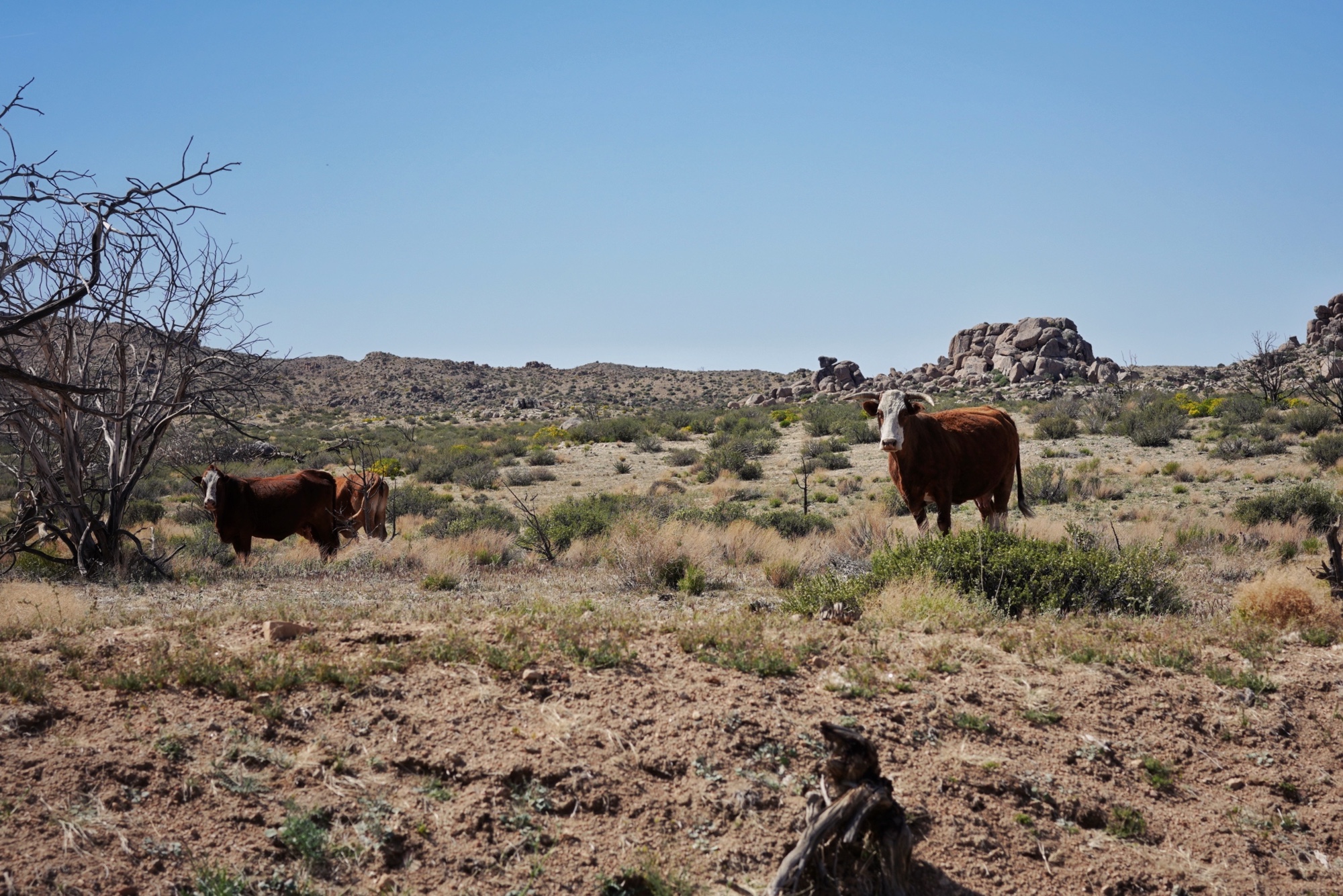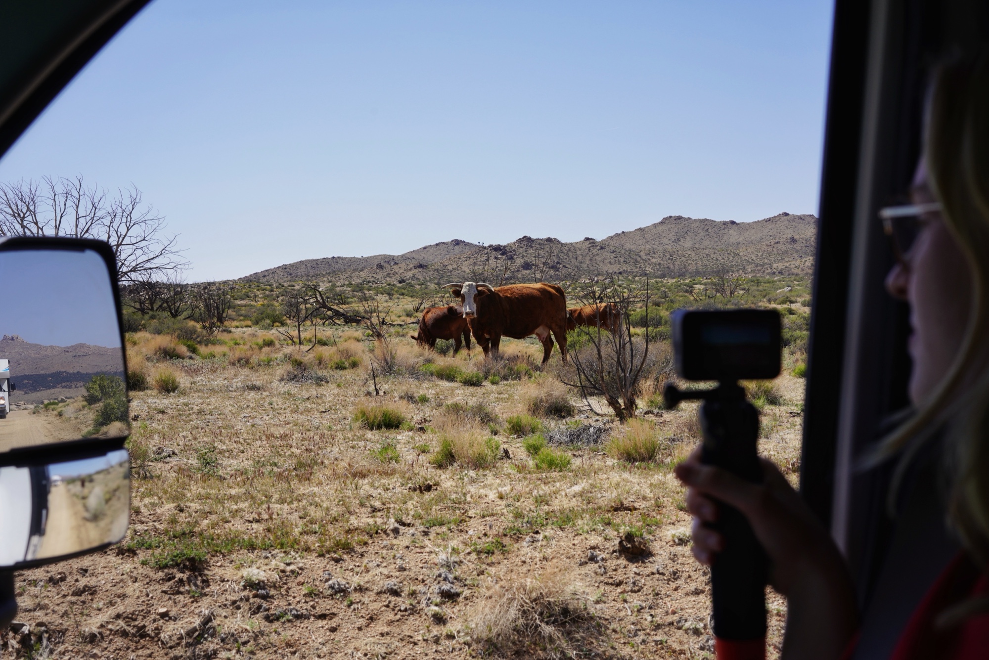 Doch warum dieser Aufwand? Heute ging es etwa 30km über eine super-heavy dirt-road in das Mojavae National Preserve. Auf deutsch bedeutet dies, auf einer unbefestigten Straße unterwegs zu sein (Sand, Hügel, Schlaglöcher). Die Reisegeschwindkeit betrug dabei unter 15 mph. Dementsprechend lange dauerte dieser Teilabschnitt zum Hole in the Wall Campground. Belohnt wurden wir nicht nur mit spektakulären Landschaftsimpressionen und einem traumhaften Campingplatz mitten im Nirgendwo, sondern wir konnten auch auf Tuchfühlung mit Rindern gehen.