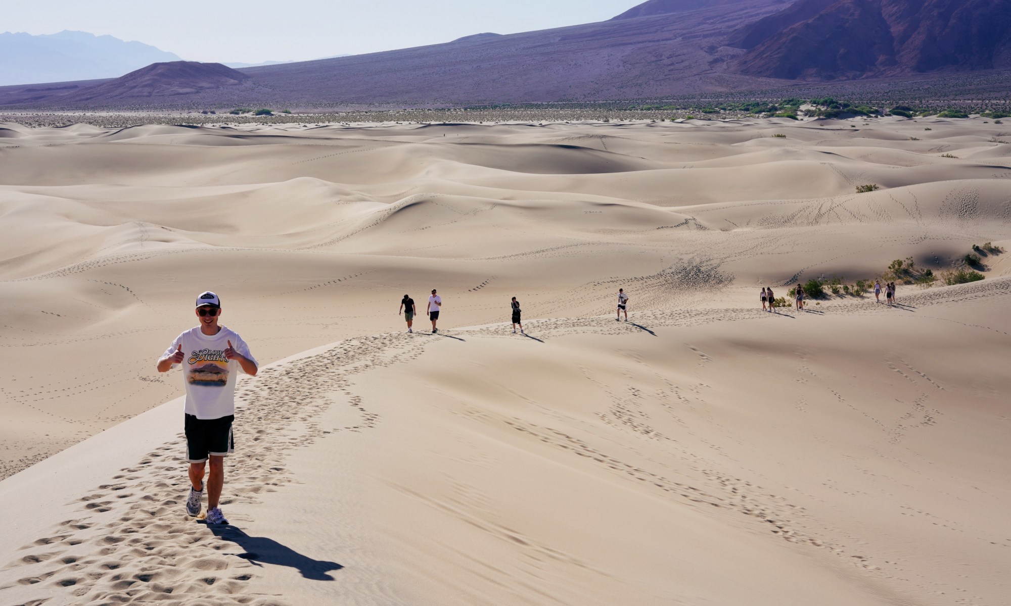 Eins vorweg: Es ist schlicht unmöglich, den gestrigen Tag und die Nacht in einem einzigen Blogbeitrag zusammenzufassen. Aber wir probieren es mal: Unser Morgen begann mitten im Death Valley, wo wir nach dem Frühstück direkt zu den Dünen aufbrachen – eine Wanderung, die unsere Waden an den Yosemite Nationalpark erinnerte.