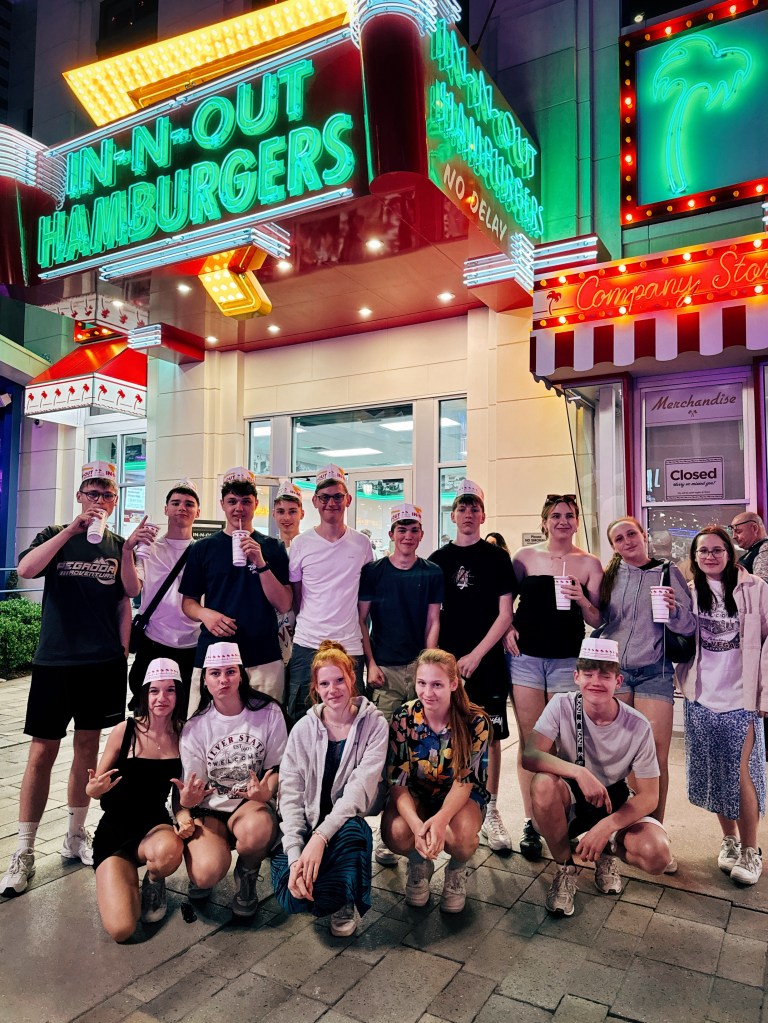Dort gilt zwar das Motto „What happens in Vegas, stays in Vegas“, aber ein paar Anekdoten wollen wir euch trotzdem nicht vorenthalten. Da Glücksspiel für die Jugendlichen natürlich nicht erlaubt ist, haben wir Betreuer*innen bis zu 10 $ für die Jugendlichen eingesetzt (wenn man schon mal in Vegas ist). Für die meisten war unser Spiel natürlich schnell vorbei – bis auf Beke, die knapp 60 $ gewann, und Moritz, der stolze 402 $ mit nach Hause nehmen oder hier ausgeben kann, was wir natürlich in einem Video festhalten mussten. Für alle anderen gilt: Pech im Spiel, Glück in der ❤️.