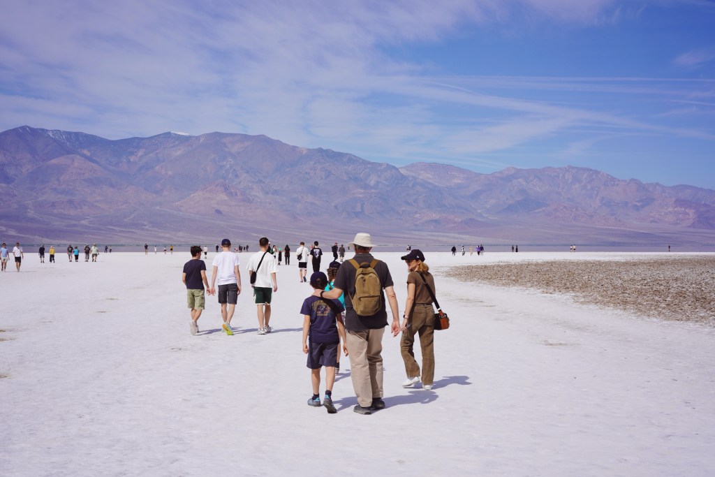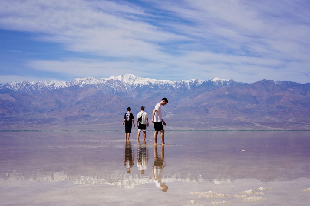 Danach folgte ein unerwartetes Erlebnis im Bad Water Basin: Ein Salzpeeling der besonderen Art. In diesem Jahr ist hier ja alles anders – anstatt durch eine Salzwüste zu laufen, konnten wir im See spazieren, was seit zwanzig Jahren nicht mehr möglich war. Das zeigt, wie selten es am tiefsten und heißesten Punkt der USA regnet.