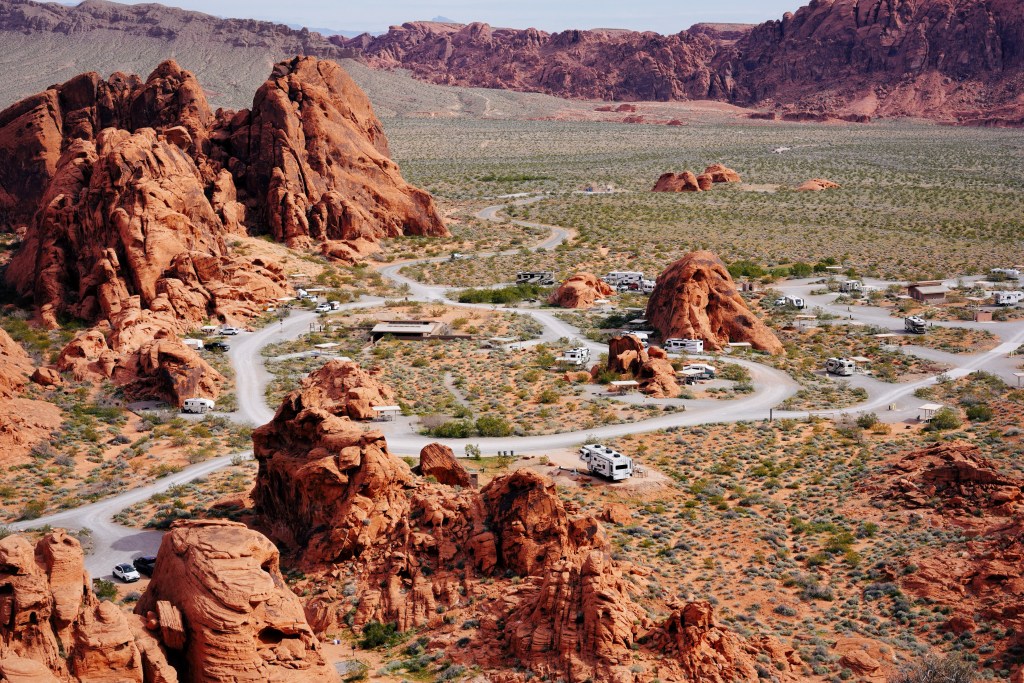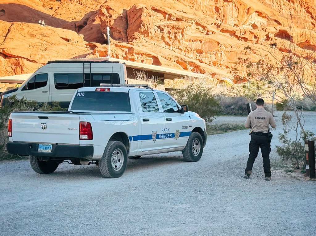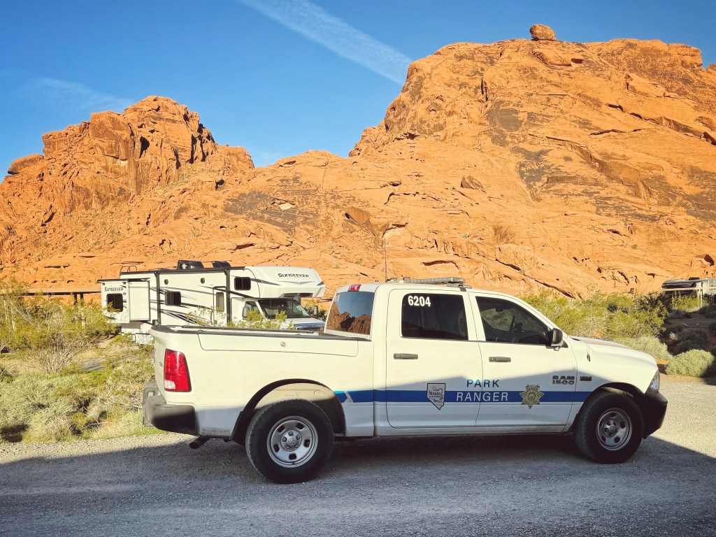 Unser Morgen im Valley of Fire begann erst einmal ganz entspannt und in aller Ruhe bei einem schönen Frühstück, doch schon bald wurde die Stimmung unerwartet spannend: „Achtung Kontrolle!“ Ein Parkranger kam zu unseren drei Wohnmobilen, um sicherzustellen, dass wir alle Gebühren für Stellplätze und den Nationalpark korrekt entrichtet hatten. Ausgestattet mit Taser, Pistole und Schlagstock machte er es ernst – doch wir konnten ohne Zögern unsere Permits präsentieren und die Kontrolle ohne Probleme überstehen.