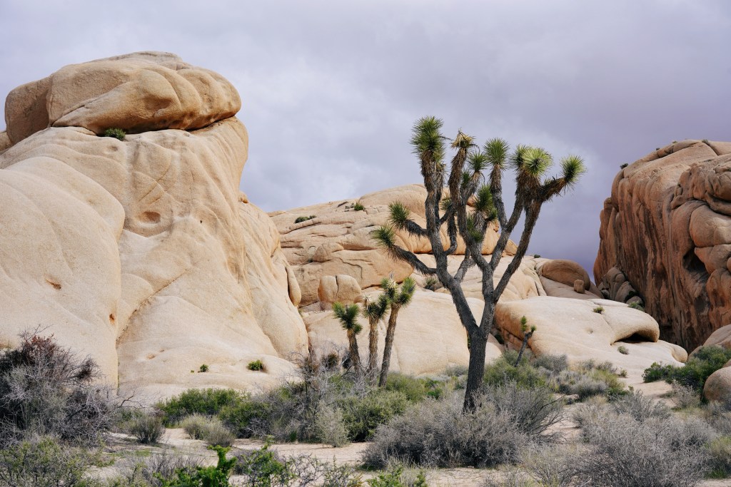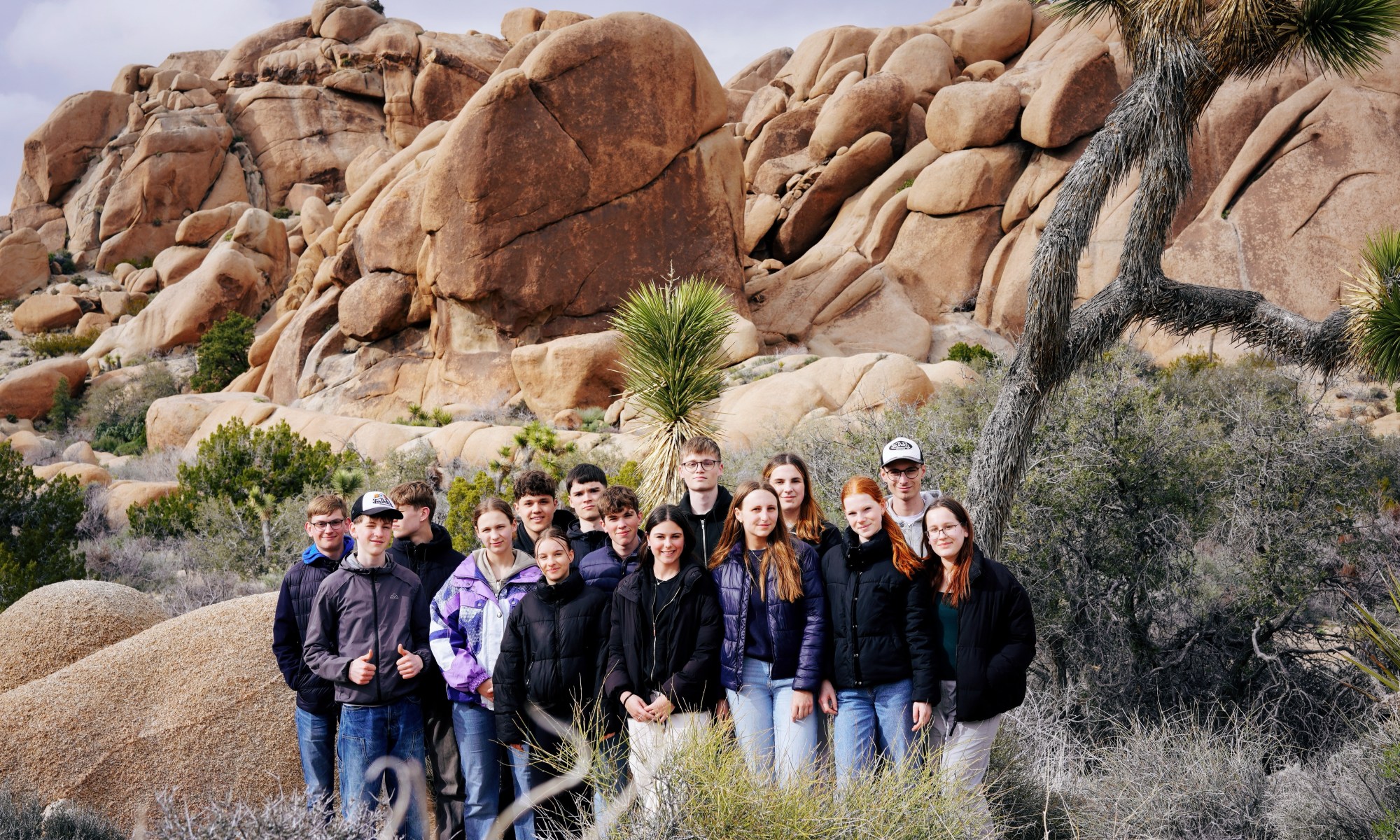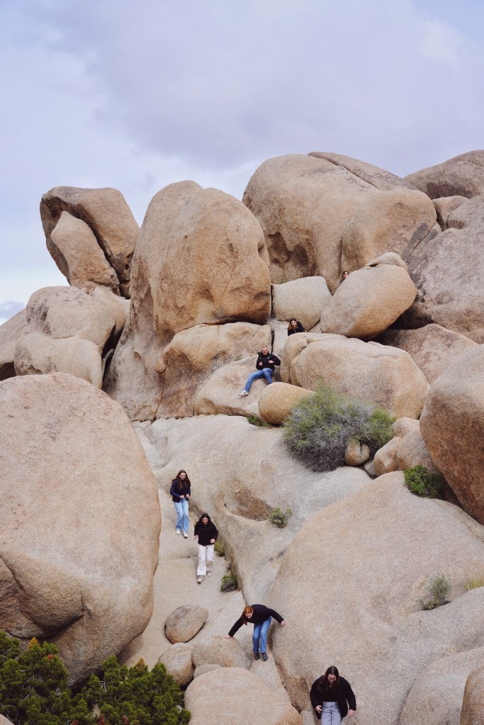 Nach einem kurzen Stopp zum Essen setzten wir unsere Reise fort zum Joshua Tree Nationalpark. Im Park angekommen, ließen wir unserer Abenteuerlust freien Lauf: Zwischen den riesigen Felsen kletterten wir umher, mal hoch, mal runter, und hätten dabei beinahe unsere Wohnmobile aus den Augen verloren.